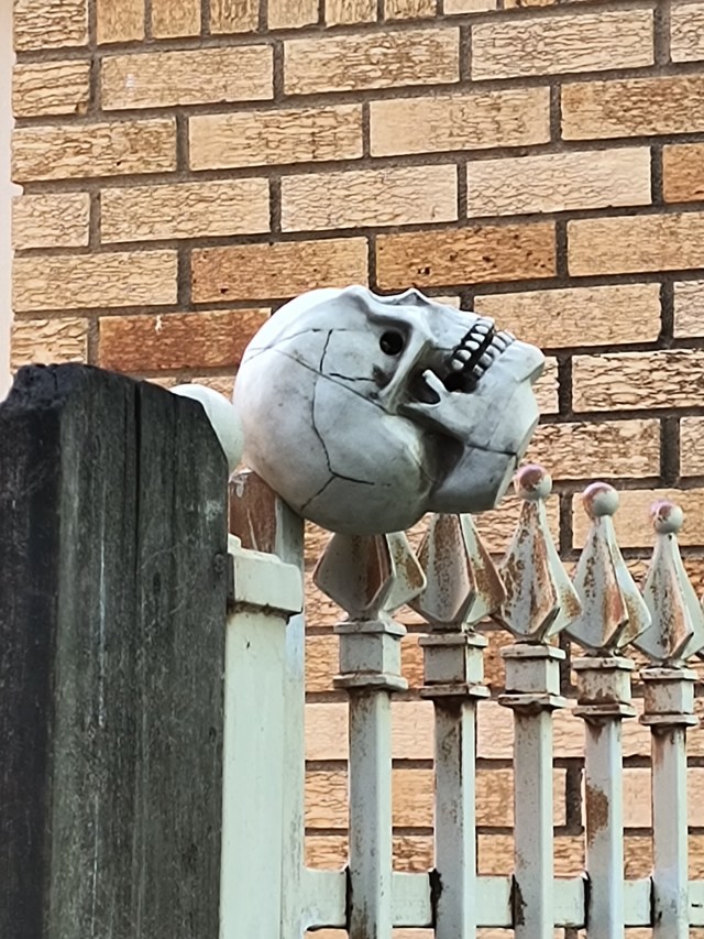Andy glanced out the window at the house next door. Perched on top of one of the ornate, smooth-tipped spears that made up the gate to the neighbor’s backyard was a large human skull. The skull was tilted upward as if it was grinning at the clouds.