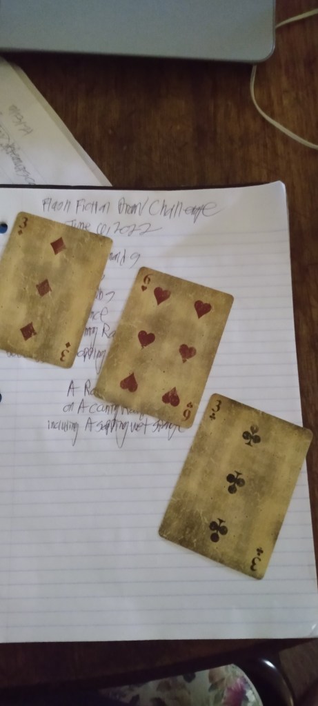 As I have no idea how to make a video, I did it offline. The results were a six of Hearts (a Romance,) a three of diamonds (a country road) and a three of clubs (a sopping wet sponge.)
