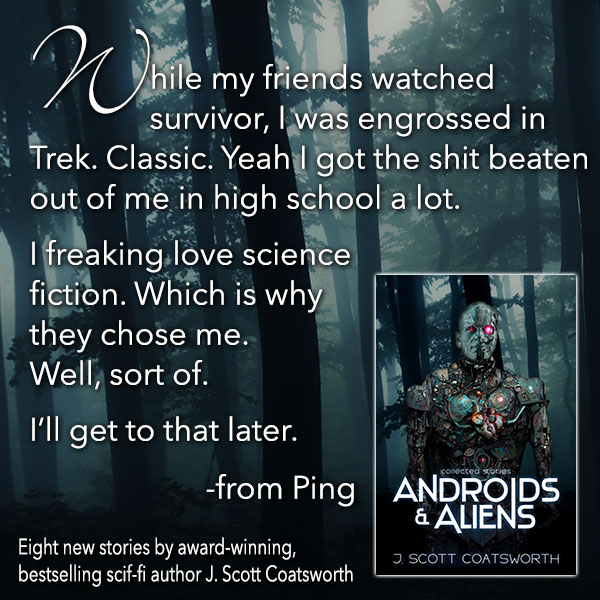 Androids & Aliens is Scott’s third short story collection – eight sci fi and sci-fantasy shorts that run the gamut from cyborgs to (comedic) alien invasions: