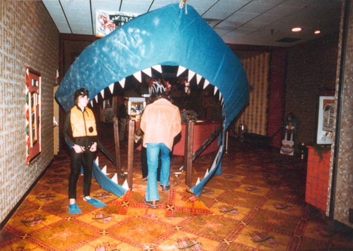 Anyway, my boss loved gimmicks, his patron saint was probably William Castle so he paid a couple of local carpenters to build an open shark’s mouth, big enough to walk through and put it at the entrance to the theater, right beside the ticket window. Of course, the skittish customers could walk around the mouth and some of them did.