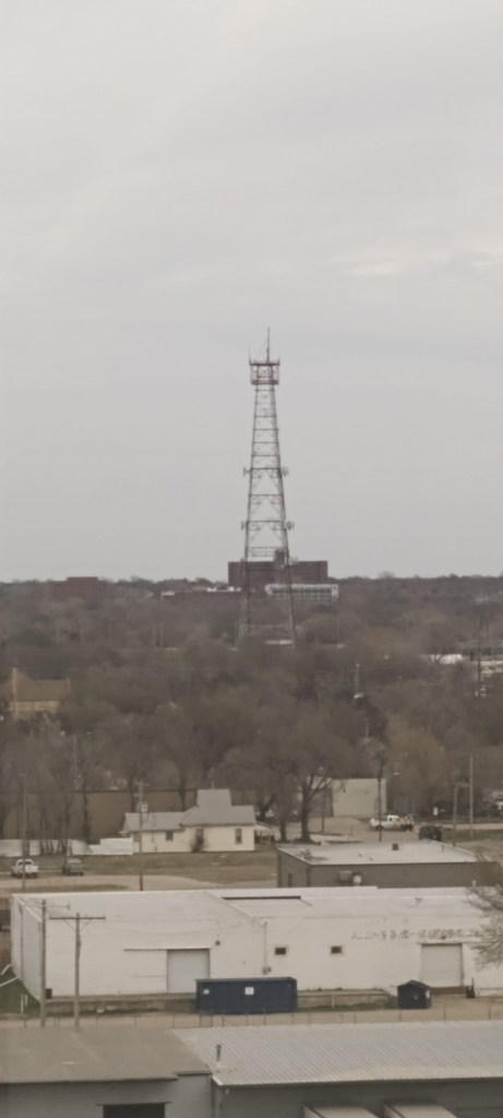 I couldn’t miss it. It was at least a mile away but it dominated the view from my big window. It was black in the early morning light, then when the mid-morning sun hit it the Tower became a wonder of red and white etched against the blue sky.