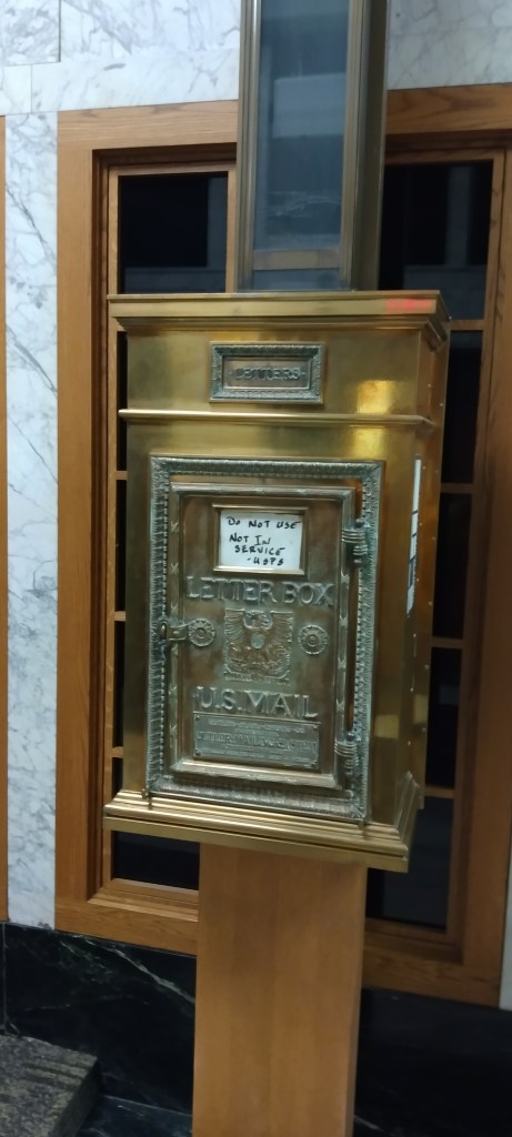 There was a small sign in magic marker where the card telling the mail pickup times would be. It read: “Do Not Use. Not In Service. USPS.”