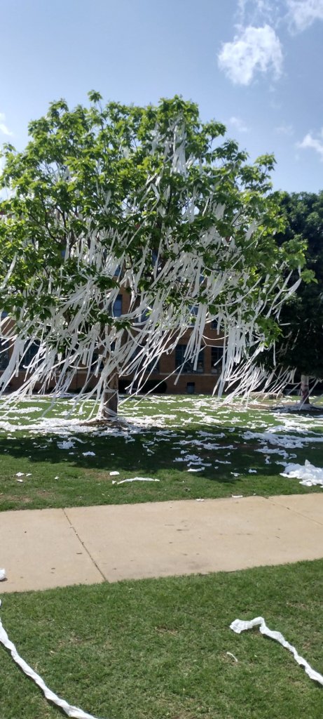 Then came the second surprise; the ghosts had to dive bomb the trees on the grounds of their old high school. This, not kids, was what caused the filmy white strips that everyone thought were toilet paper.