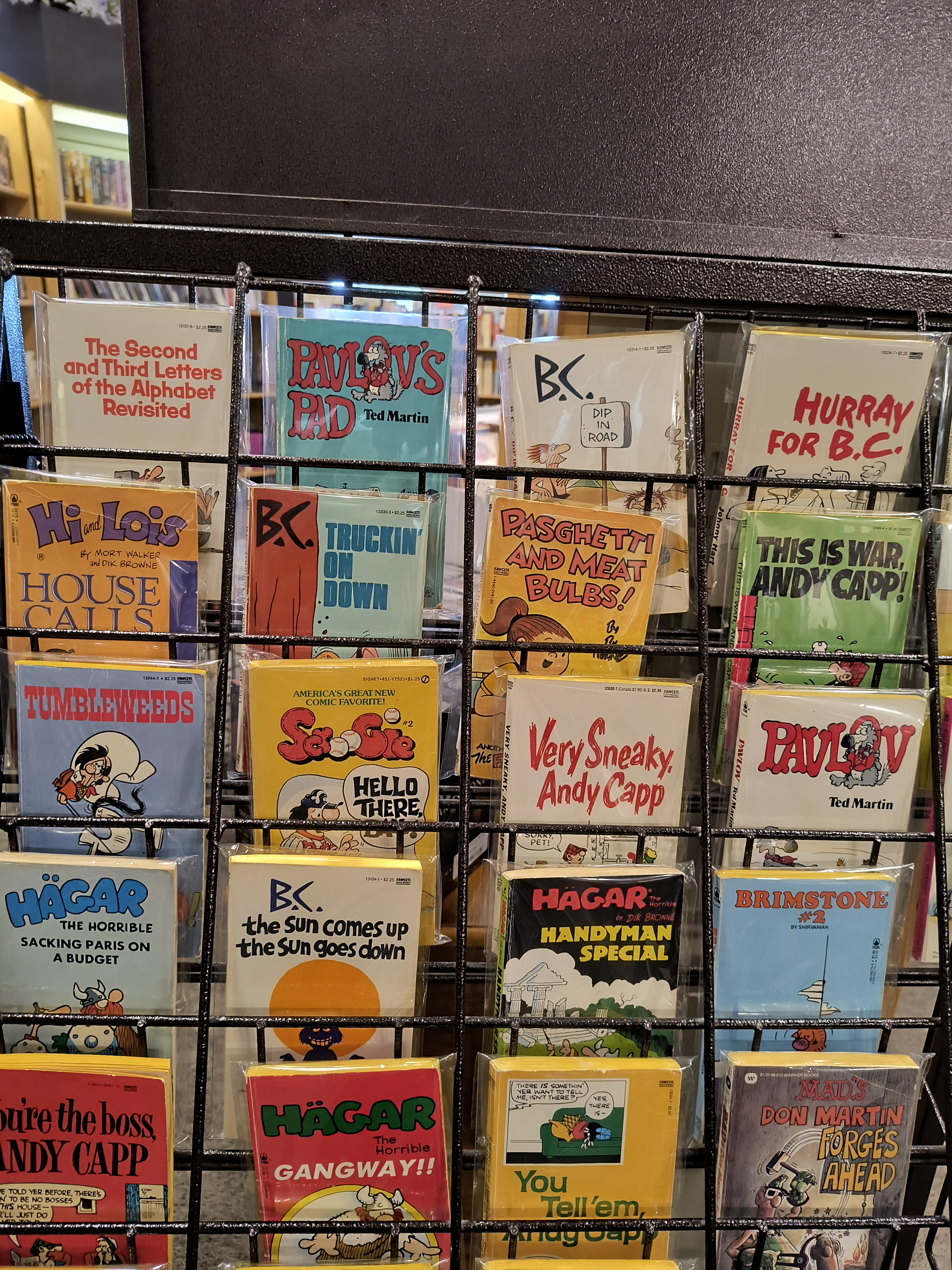 Went to Book a Holic on West 21st Street here in Wichita, Kansas and saw this fun rack of paperback reprints of comic strips that you used to see everywhere. I remember most of these!
