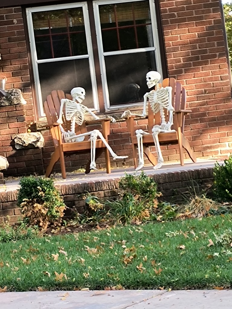 There, sitting on the metal chairs that stayed out there in all kinds of weather were two full-sized human skeletons.