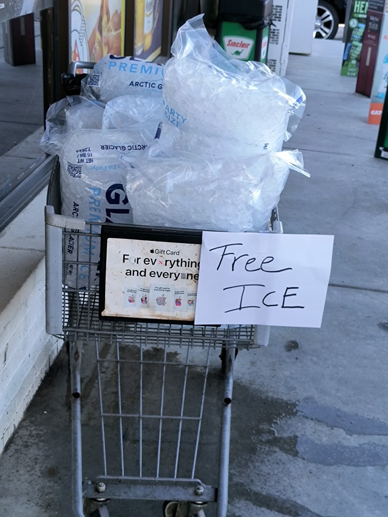 “Probably gonna run out of that real soon,” Jamie said. “Hey, did you see that cart in front of the store the other day with free bags of ice?”