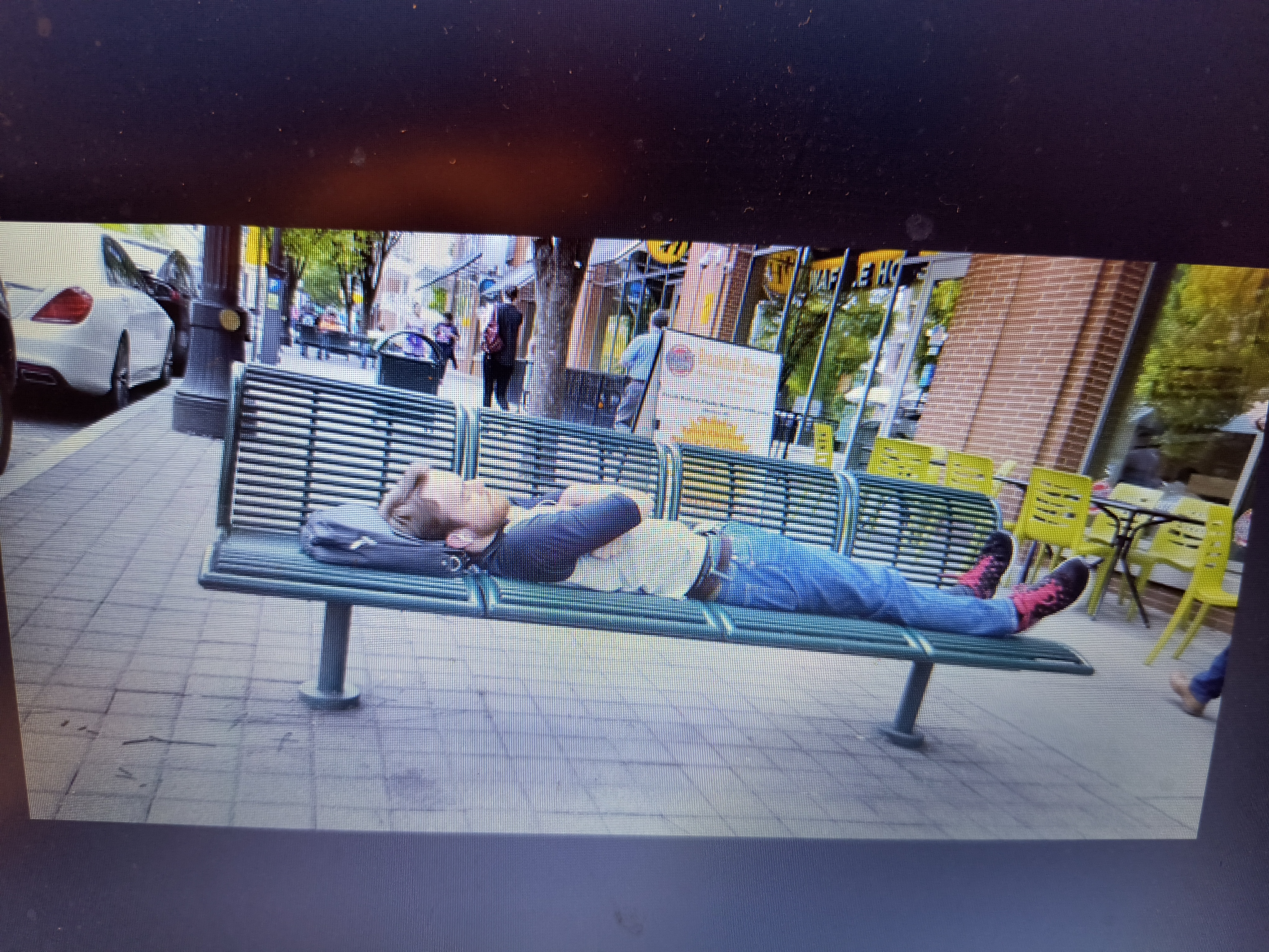 Laying there on one of the metal benches was a young man, probably twenty-something, reddish hair and beard, sleeping soundly.