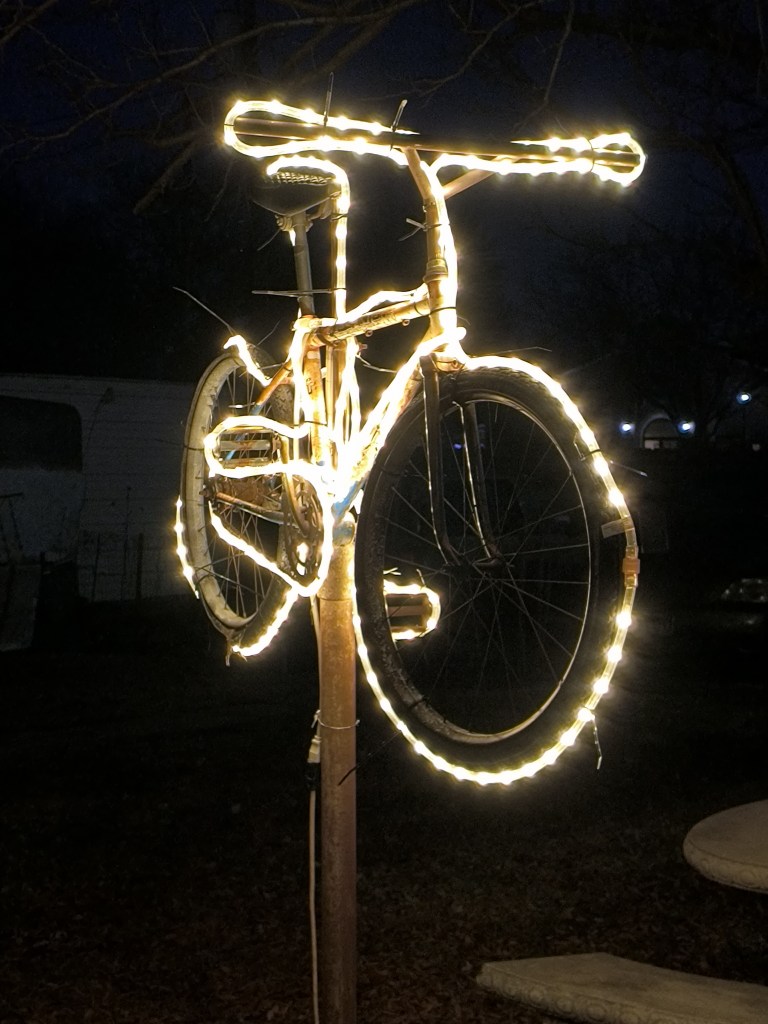 And now my little cousin’s little daughter has long outgrown the Star Cruiser, so for Christmastime they fastened the bike to a post in their yard.