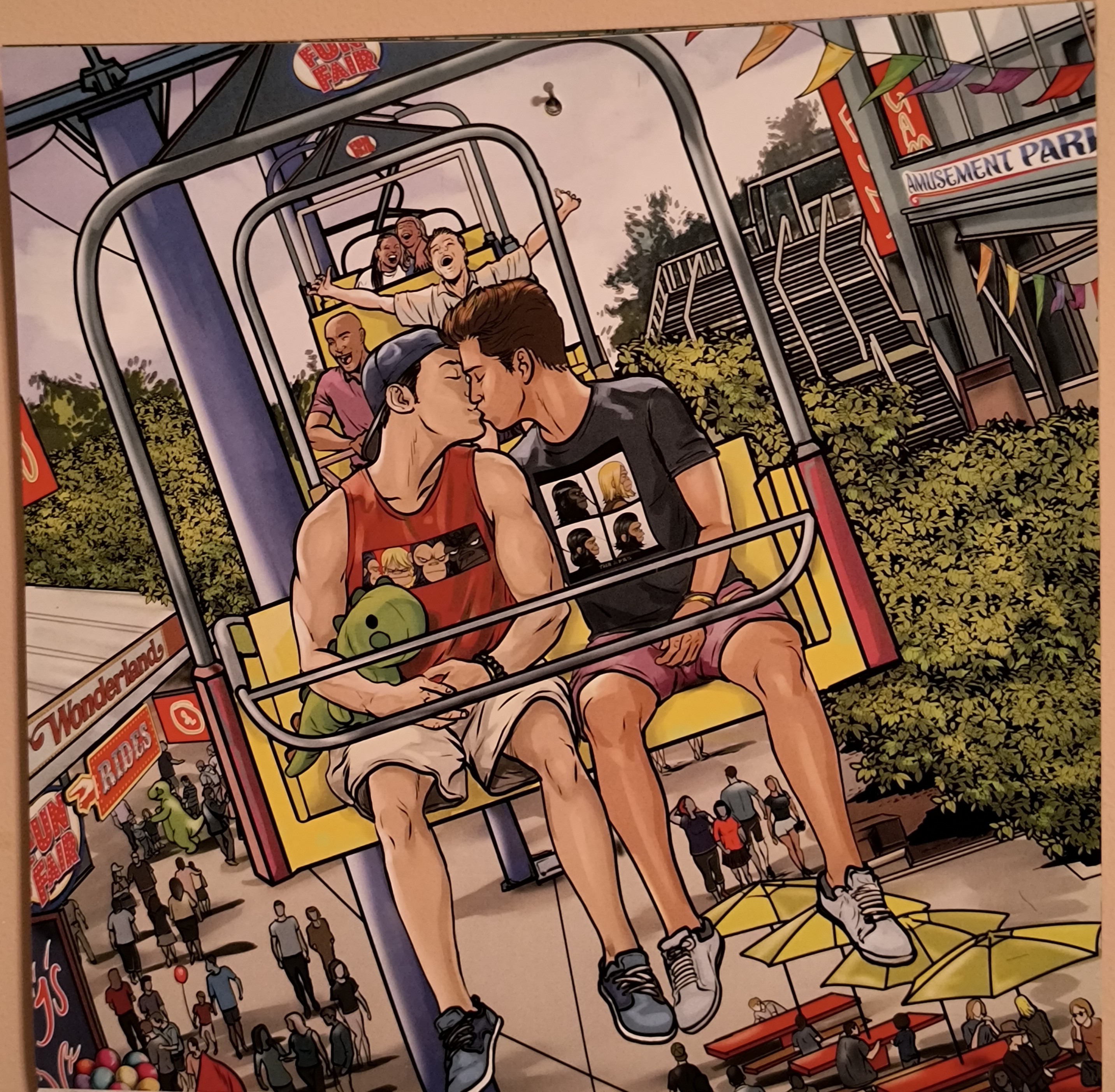 “You okay?” Burt, his boyfriend in his “Planet Of the Apes” t-shirt said, sitting next to him what felt like a million feet up.