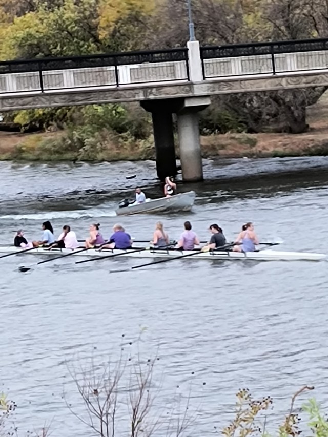 Just past the bridge the rowing team was on a practice run. But now the coxswain was shouting directions at the team, the women rowing frantically, a coach in a nearby motorboat shouting through a megaphone “Don’t worry! I don’t think it’s real!” and a metallic-green sea serpent following their boat. Long neck, humps sticking out of the water, glass eyes glistening in the sunlight, mouth wide open, rivets showing all over what ever part of it was above water.