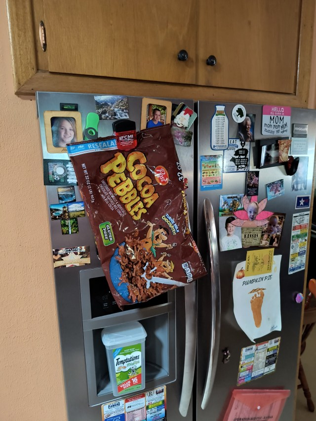 Even the empty bag of cereal held by a refrigerator magnet to the door because Rich or Todd thought it worked better than writing a note that they’d forget to take to the store, so in the end one of them would zap a picture of it with his phone and that would be the shopping list.
